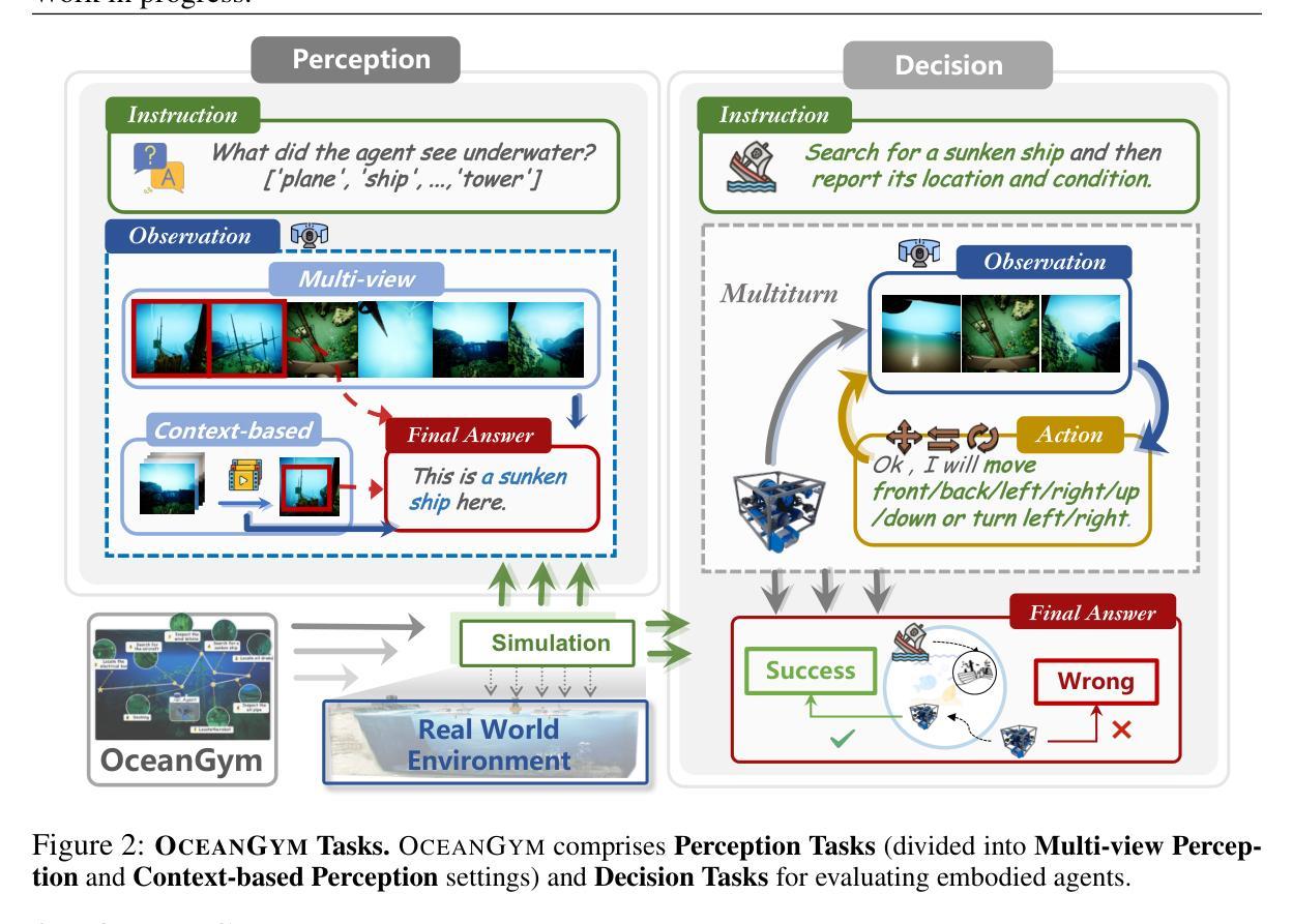 - OceanGym涵盖了八个现实任务域,包括处理低可见度、动态洋流等挑战。