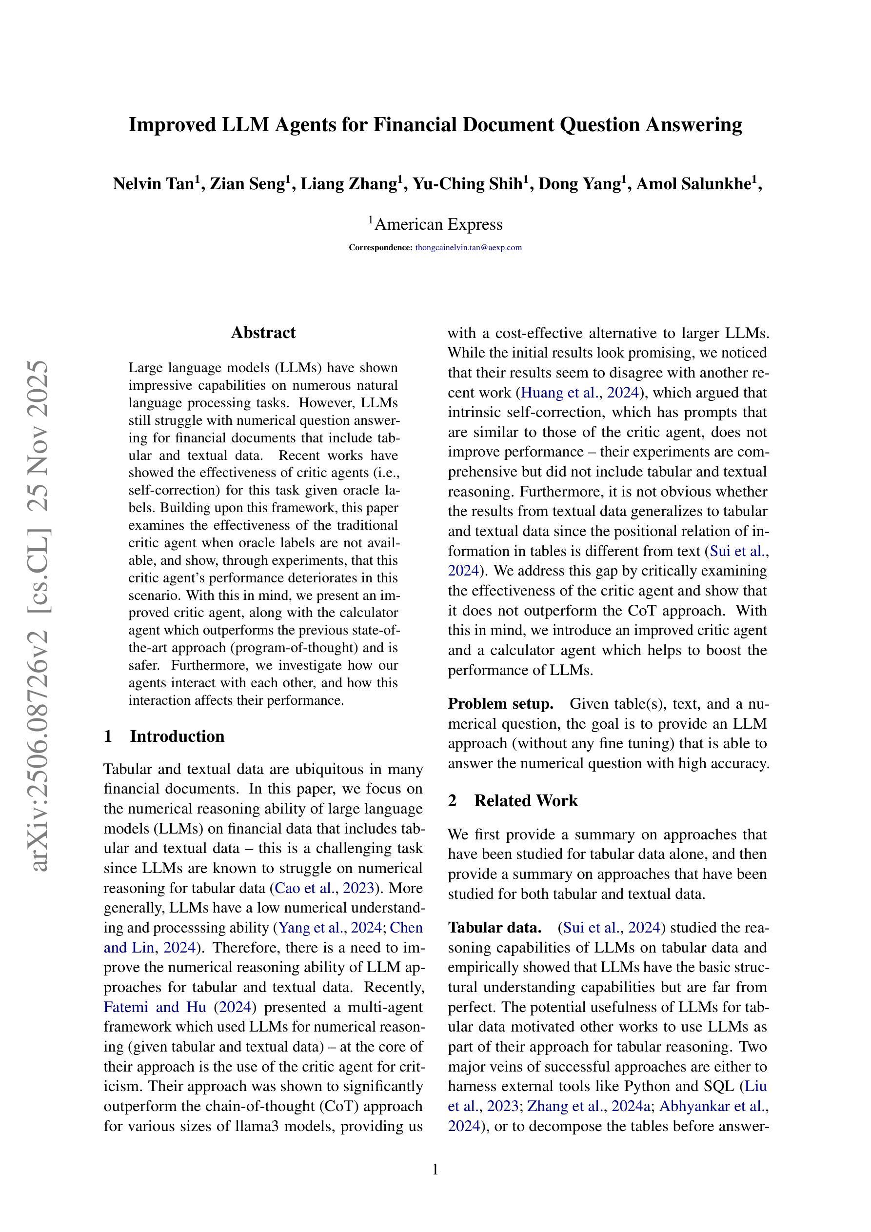 本文探讨了大型语言模型在财务文档中数值问答任务的挑战。研究指出,当没有提供标准标签时,传统的批判代理性能会下降。因此,提出了一种改进的批判代理和计算器代理,该方法优于之前的程序化思考方法,并具有更高的安全性。此外,本文还研究了这些代理之间的交互及其对性能的影响。
