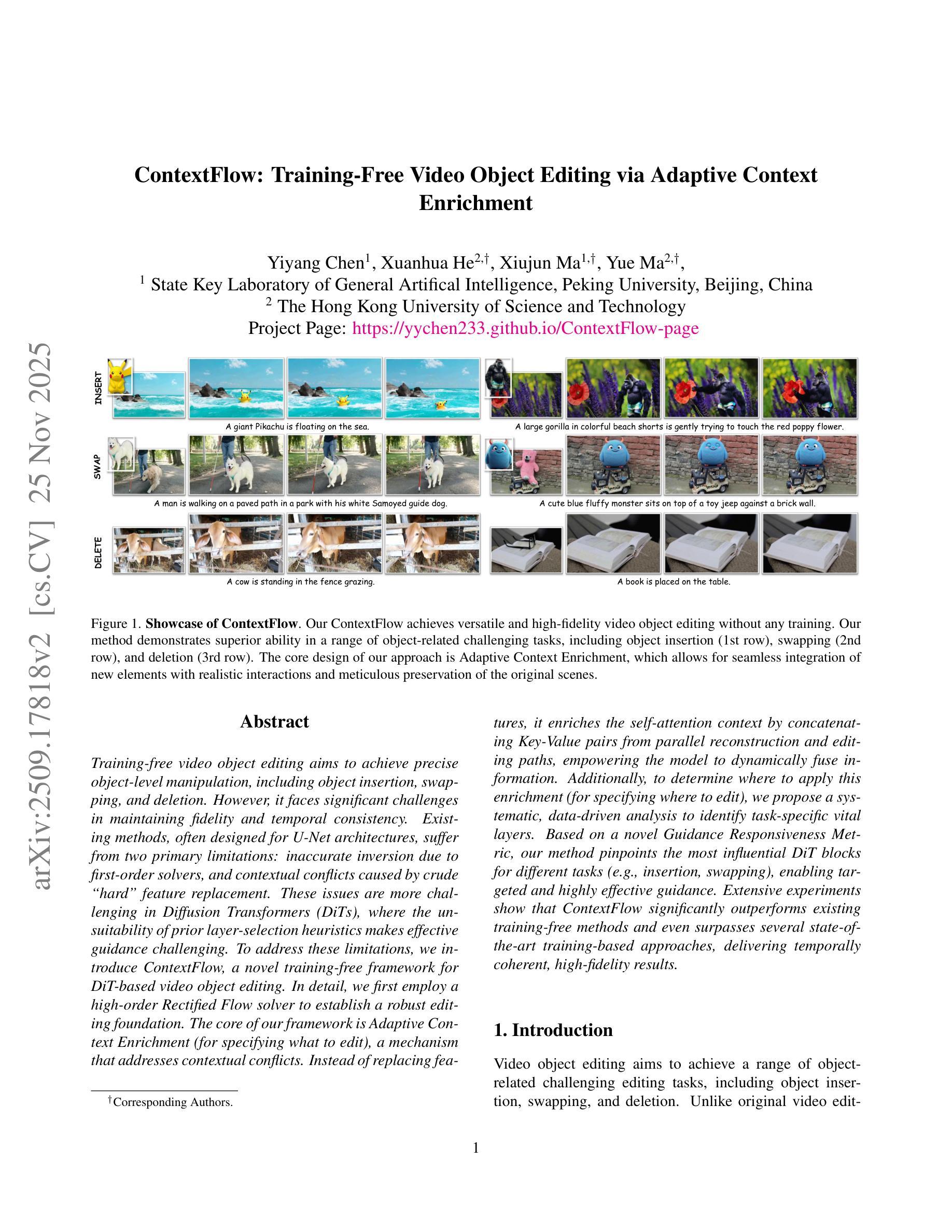 无训练视频对象编辑旨在实现精确的对象级操作,包括对象插入、替换和删除。然而,它在保持保真度和时间一致性方面面临重大挑战。现有方法通常针对U-Net架构设计,存在两个主要局限:由于一阶求解器导致的不准确反转,以及由粗糙的“硬”特征替换引起的上下文冲突。在扩散转换器(DiTs)中,这些问题更具挑战性,先前层次选择启发式的不适用性使得有效指导变得困难。为了解决这些局限性,我们引入了ContextFlow,这是一种用于DiT基无训练视频对象编辑的新型框架。具体来说,我们首先采用高阶Rectified Flow求解器来建立稳健的编辑基础。我们框架的核心是自适应上下文丰富(用于指定要编辑的内容),这是一种解决上下文冲突的机制。它并非替换特征,而是丰富自注意力上下文,通过并行重建和编辑路径中的键值对拼接,使模型能够动态融合信息。此外,为了确定应用此丰富的位置(用于指定编辑的位置),我们提出了一种系统、数据驱动的分析方法,以识别特定任务的关键层次。基于新型指导响应度量,我们的方法准确指出了不同任务(如插入、替换)中最具影响力的DiT块,实现了有针对性的和高效的指导。大量实验表明,ContextFlow在无训练方法中表现突出,甚至超越了一些基于训练的最先进方法,产生了时间连贯、高保真度的结果。