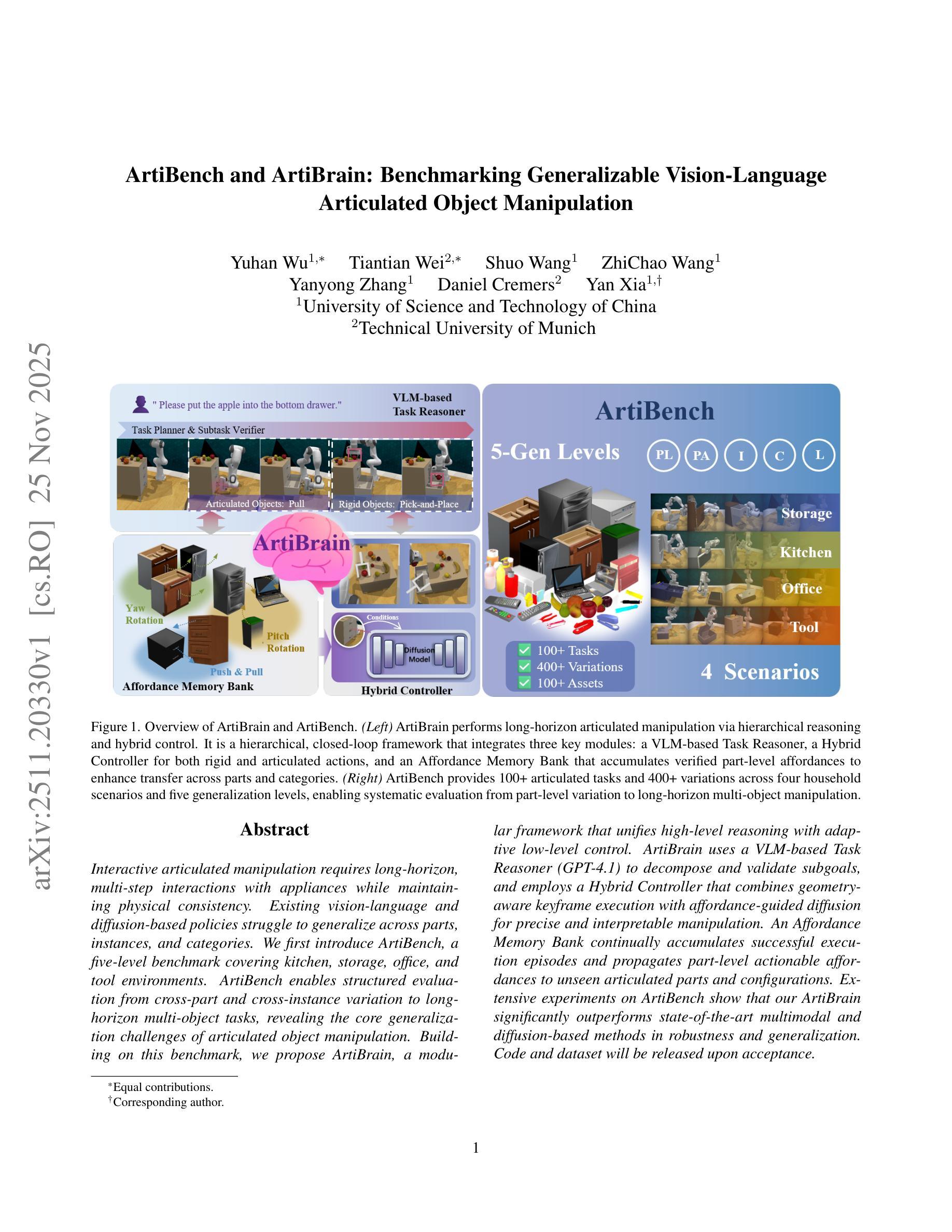 交互式关节操控需要长期、多步骤与设备的互动,同时保持物理一致性。现有的视觉语言政策和扩散政策很难在部分、实例和类别之间进行推广。我们首先推出了ArtiBench,这是一个涵盖厨房、存储、办公室和工具环境的五个级别的基准测试。ArtiBench能够实现对跨部分和跨实例变化的结构化评估,以及长期多目标任务,揭示了关节对象操作的核心推广挑战。基于此基准测试,我们提出了ArtiBrain,这是一个模块化框架,能够将高级推理与自适应低级控制统一起来。ArtiBrain使用基于VLM的任务推理器(GPT-4.1)来分解和验证子目标,并采用混合控制器,结合几何感知的关键帧执行和基于功能的扩散,实现精确和可解释的操控。功能记忆库不断累积成功的执行片段,并将部分级别的可操作功能传播到看不见的关节部分和配置中。在ArtiBench上的广泛实验表明,我们的ArtiBrain在稳健性和泛化方面显著优于最新的多模态和基于扩散的方法。论文通过后,我们将公开代码和数据集。