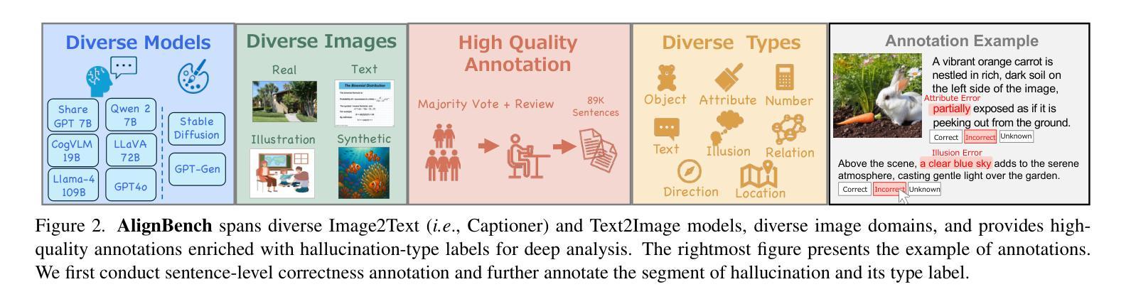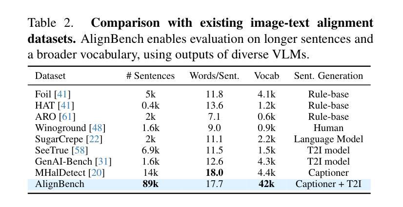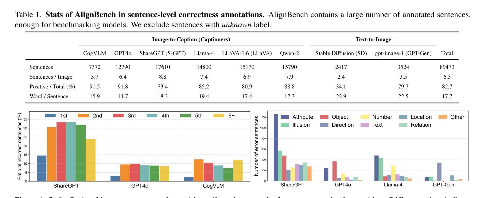 评估图像文本对齐模型(如CLIP)对于实现视觉和语言学表征的融合至关重要。但现有基准测试主要依赖于基于规则的干扰或简短字幕,这限制了其衡量精细对齐的能力。我们推出了AlignBench,这是一个通过评估由多种图像到文本和文本到图像模型生成的各种详细的图像字幕对来衡量图像文本对齐的新指标。每个句子都经过正确性标注,能够直接评估视觉语言模型的对齐评估能力。对一系列基于解码器的视觉语言模型的基准测试揭示了三个关键发现:(i)即使针对组合推理进行定制的CLIP模型仍然近乎盲目;(ii)检测器系统性地高估了早期句子;(iii)它们表现出强烈的自我偏好,偏爱自己的输出并损害检测性能。我们的项目页面将在https://dahlian00.github.io/AlignBench/上提供。