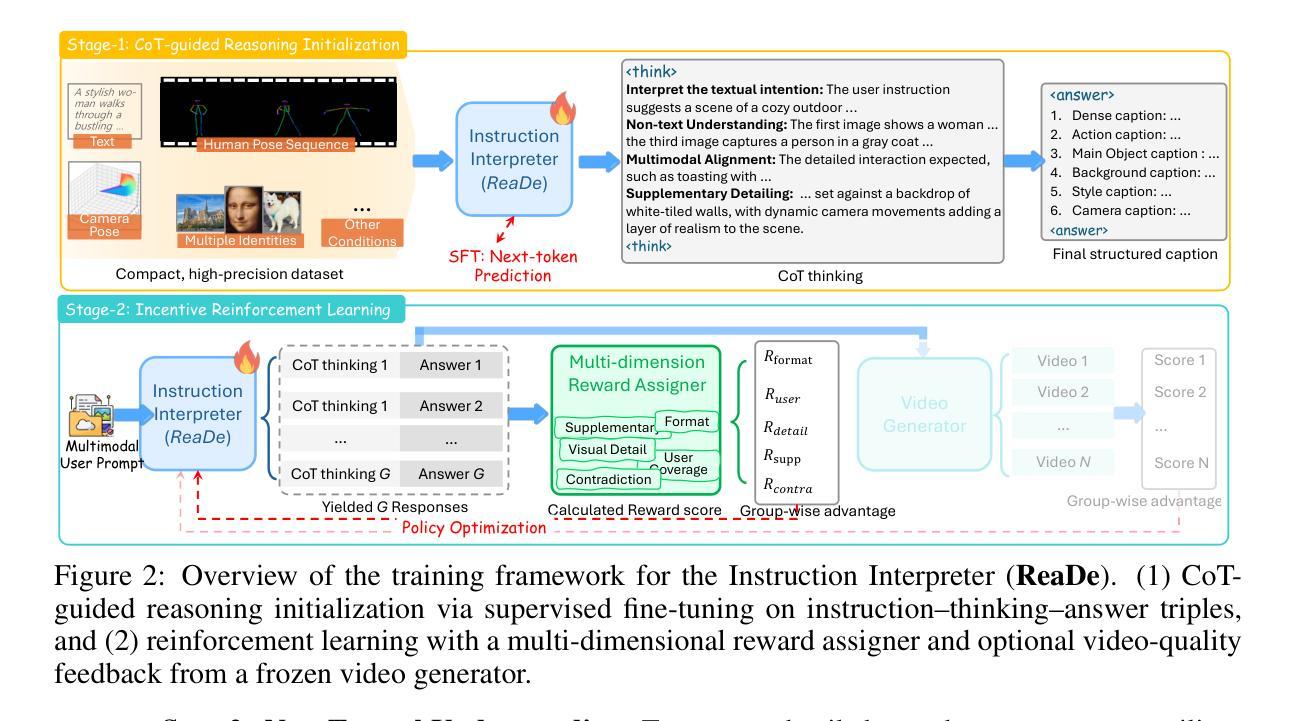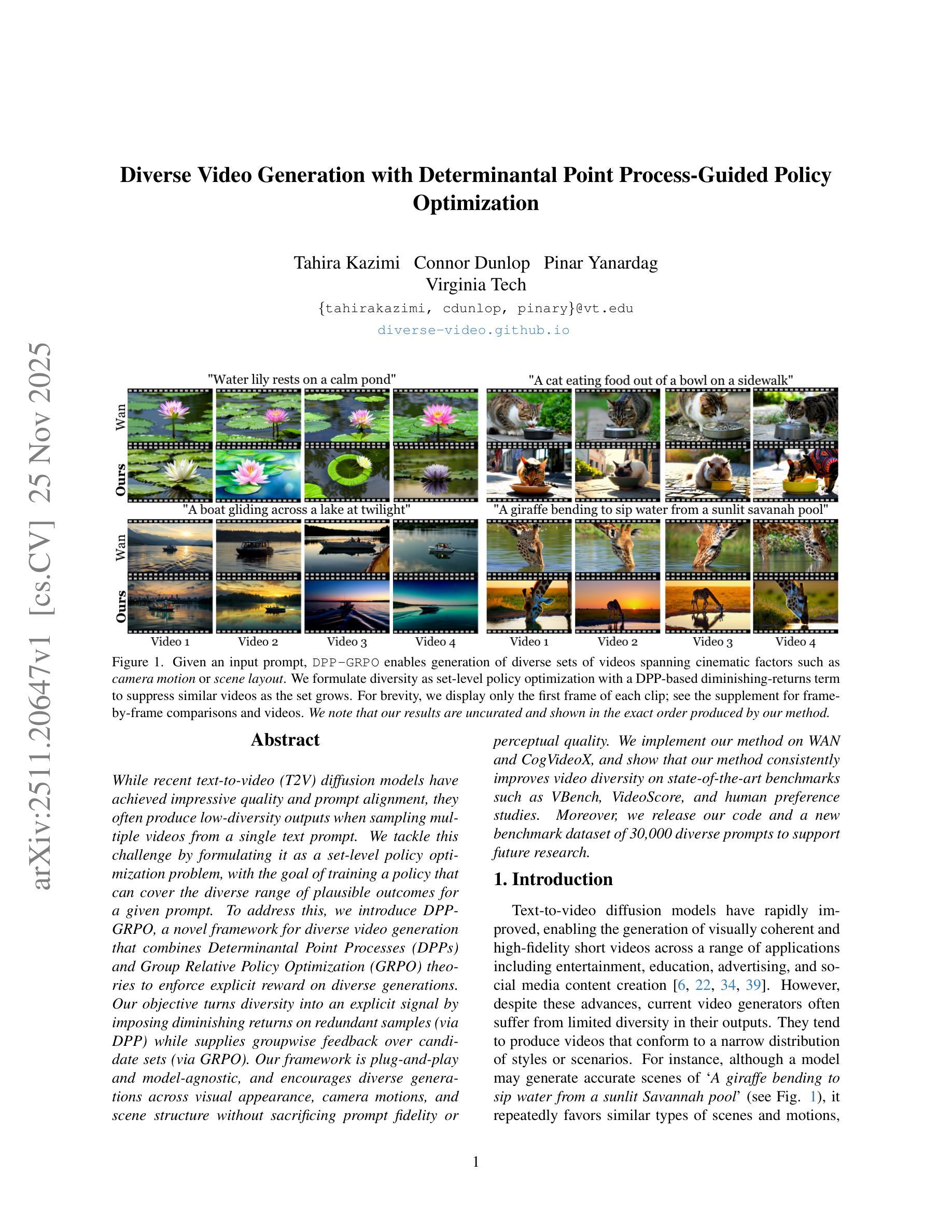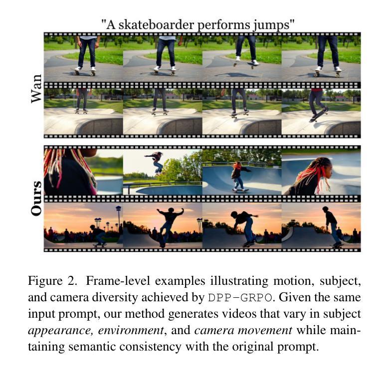 虽然最近的文本到视频(T2V)扩散模型在质量和即时对齐方面取得了令人印象深刻的成就,但它们在从单个文本提示中采样多个视频时通常会产生低多样性的输出。我们通过将其制定为集合级策略优化问题来解决这一挑战,目标是训练一个能够覆盖给定提示的各种可能结果的策略。为解决此问题,我们引入了DPP-GRPO,这是一个用于多样化视频生成的新型框架,结合了行列式点过程(DPPs)和组相对策略优化(GRPO)理论,以对多样化的生成强制执行明确的奖励。我们的目标是通过在冗余样本上产生递减收益(通过DPP)而对多样性施加明确的信号,同时为候选集提供组反馈(通过GRPO)。我们的框架即插即用,与模型无关,可在视觉外观、相机运动和场景结构方面鼓励多样化的生成,而不会牺牲提示保真度或感知质量。我们在WAN和CogVideoX上实施了我们的方法,并证明我们的方法在VBench、VideoScore和人类偏好研究等最新基准测试上始终提高了视频多样性。此外,我们发布了我们的代码和包含3万个多样提示的新基准数据集,以支持未来的研究。