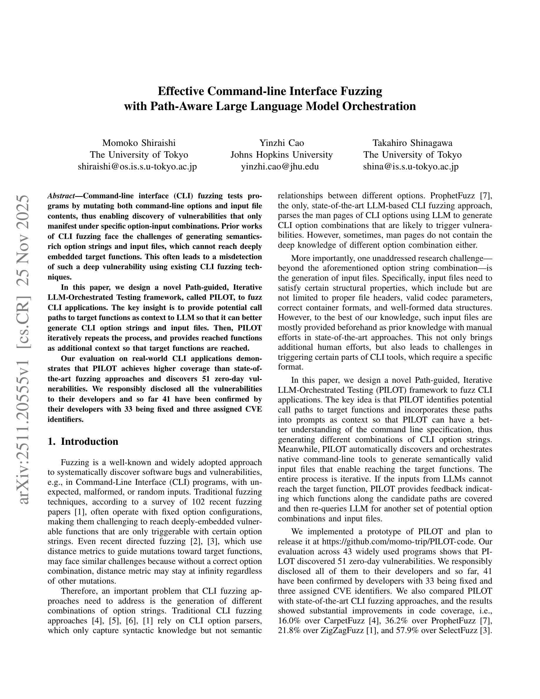 命令行接口(CLI)模糊测试程序通过对命令行选项和输入文件内容进行变异,从而发现仅在特定选项-输入组合下才会出现的漏洞。之前的CLI模糊测试工作面临着生成语义丰富的选项字符串和输入文件的挑战,这些文件无法深入到目标函数。这往往导致使用现有的CLI模糊测试技术误检此类深层漏洞。在本文中,我们设计了一个新型的路径引导、迭代LLM协同测试框架,称为PILOT,用于模糊CLI应用程序。关键洞察力在于为LLM提供潜在函数调用路径作为上下文,以便其能更好地生成CLI选项字符串和输入文件。然后,PILOT通过迭代重复此过程,并提供已访问函数作为附加上下文,以便访问目标函数。我们对真实世界的CLI应用程序的评估表明,PILOT的覆盖率高于最新的模糊测试方法,并发现了51个零日漏洞。我们已负责任地向开发人员披露了所有漏洞,迄今为止,已有41个漏洞得到了开发人员的确认,其中33个已被修复,并分配了三个CVE标识符。
