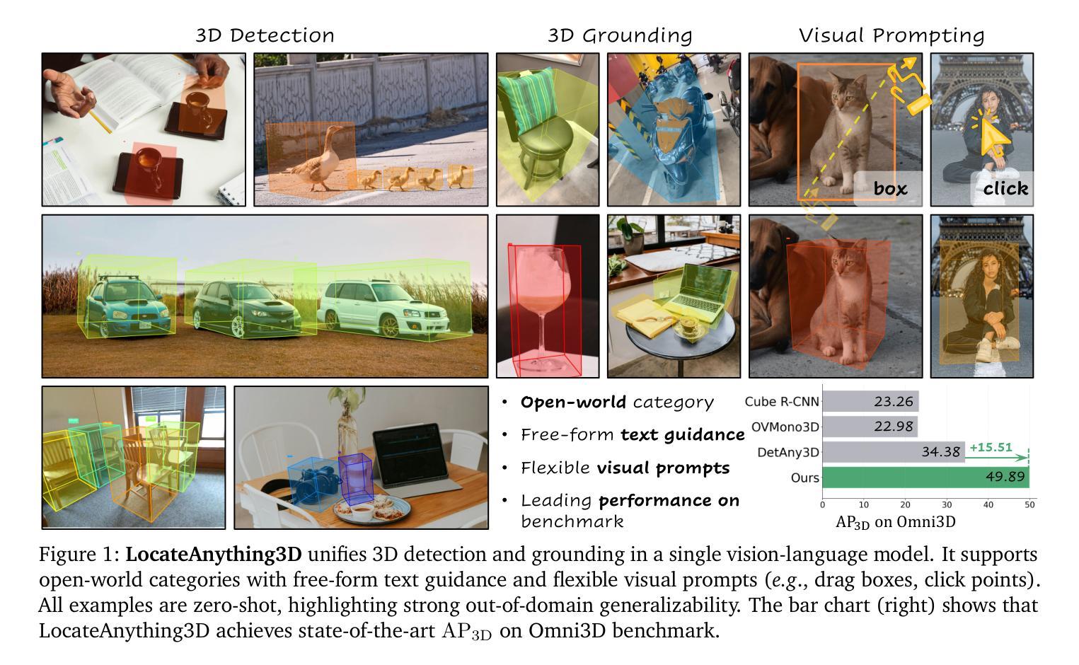 - LocateAnything3D保留了VLM的开放词汇和视觉提示功能,无需使用专门的头部结构。