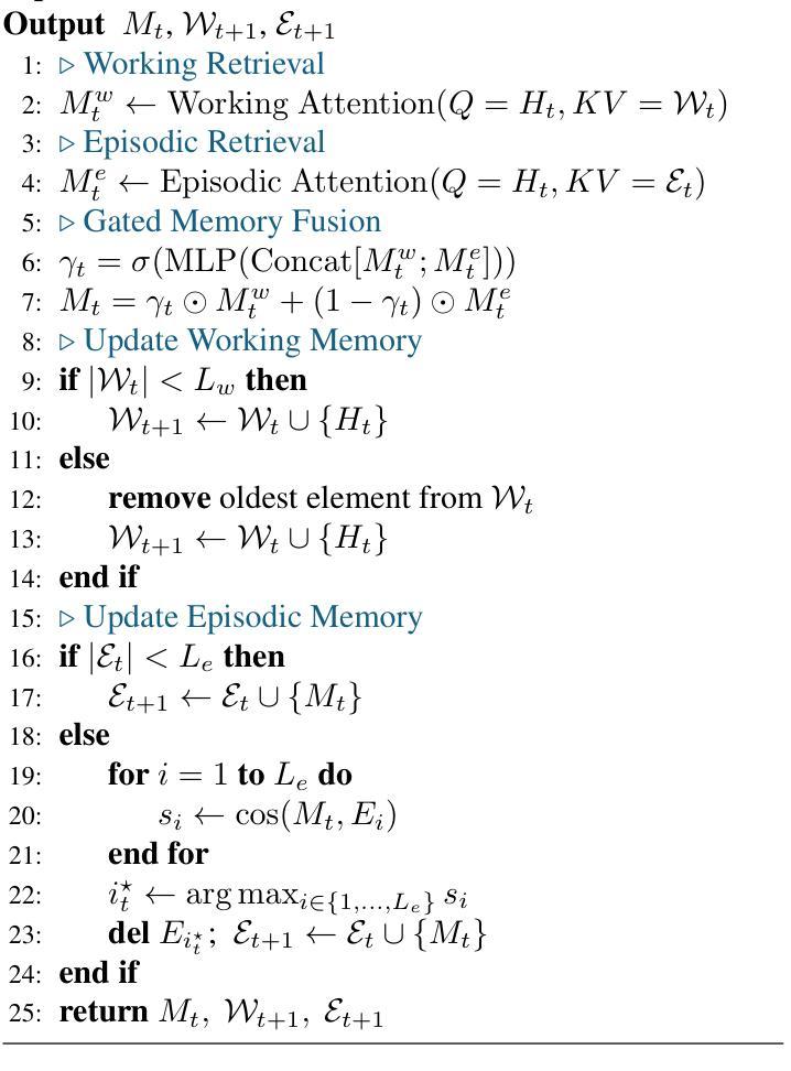 - 双记忆模块包括工作记忆和情景记忆,分别关注即时上下文和整合长期关键信息。