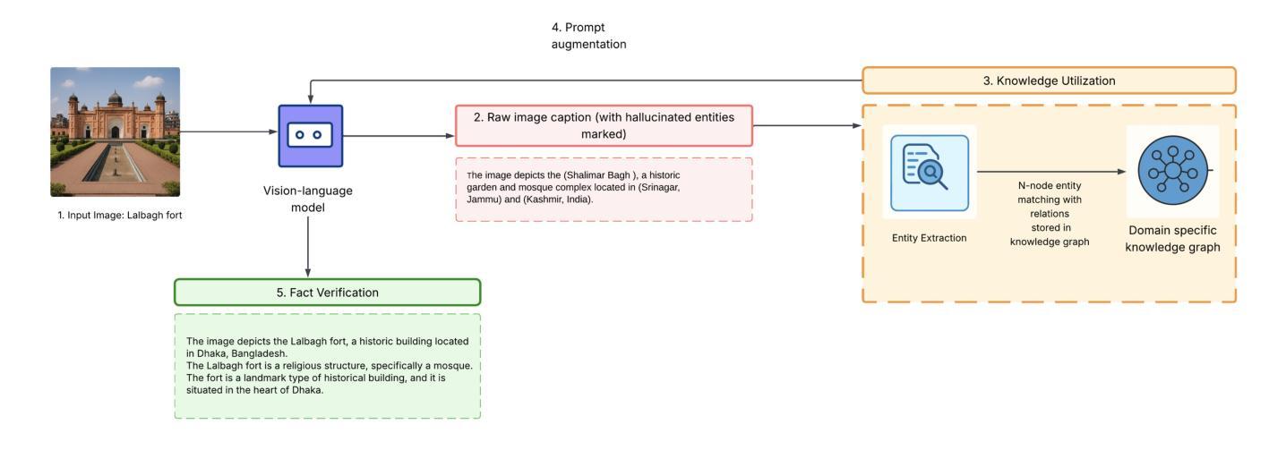 Visual Language Models (VLMs) are powerful generative tools but often produce factually inaccurate outputs due to a lack of robust reasoning capabilities. While extensive research has been conducted on integrating external knowledge for reasoning in large language models (LLMs), such efforts remain underexplored in VLMs, where the challenge is compounded by the need to bridge multiple modalities seamlessly. This work introduces a framework for knowledge-guided reasoning in VLMs, leveraging structured knowledge graphs for multi-hop verification using image-captioning task to illustrate our framework. Our approach enables systematic reasoning across multiple steps, including visual entity recognition, knowledge graph traversal, and fact-based caption refinement. We evaluate the framework using hierarchical, triple-based and bullet-point based knowledge representations, analyzing their effectiveness in factual accuracy and logical inference. Empirical results show that our approach improves factual accuracy by approximately 31% on preliminary experiments on a curated dataset of mixtures from Google Landmarks v2, Conceptual captions and Coco captions revealing key insights into reasoning patterns and failure modes. This work demonstrates the potential of integrating external knowledge for advancing reasoning in VLMs, paving the way for more reliable and knowledgable multimodal systems.