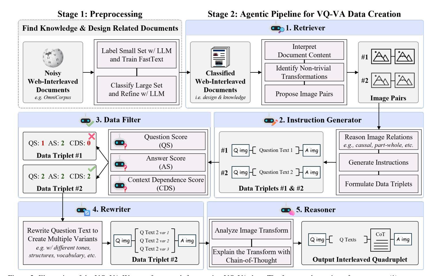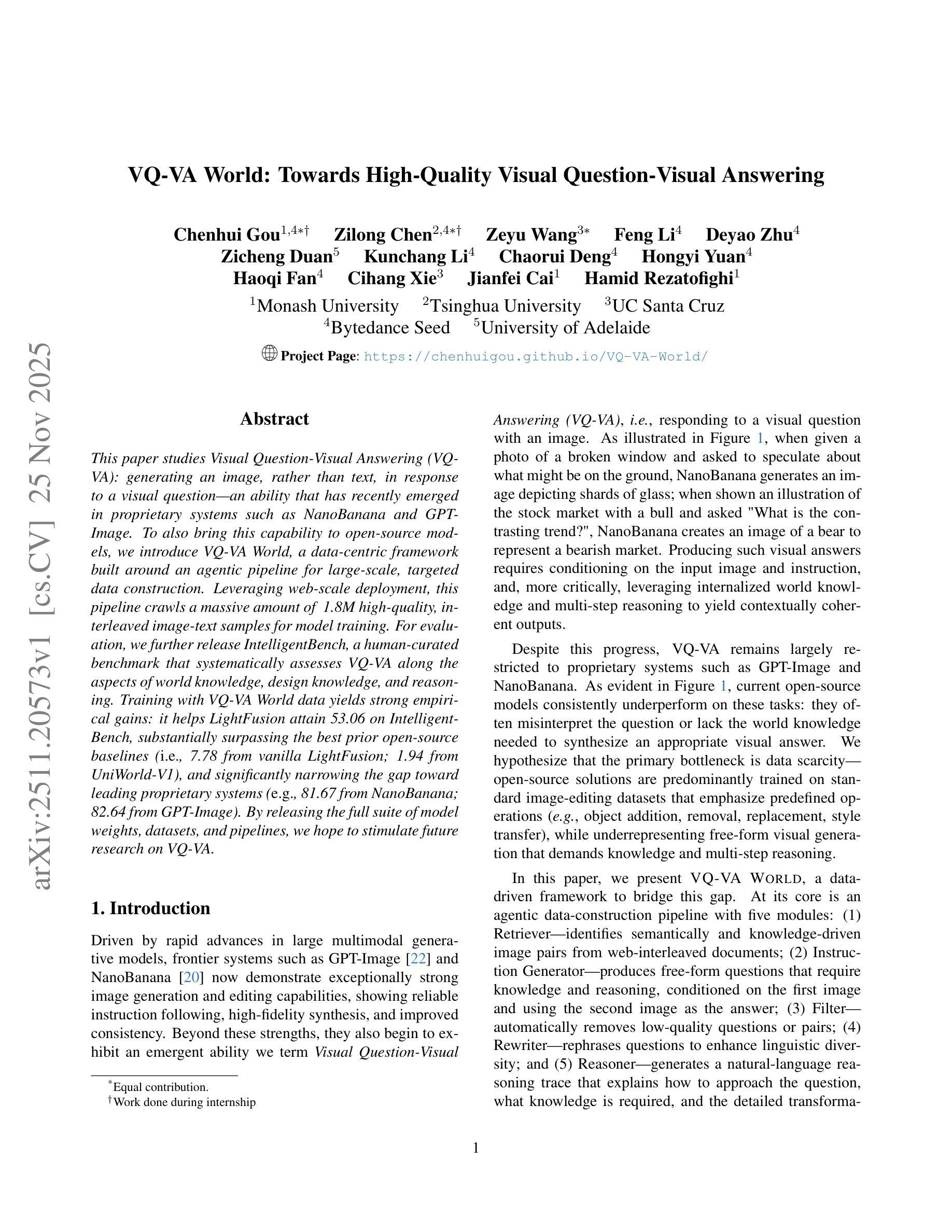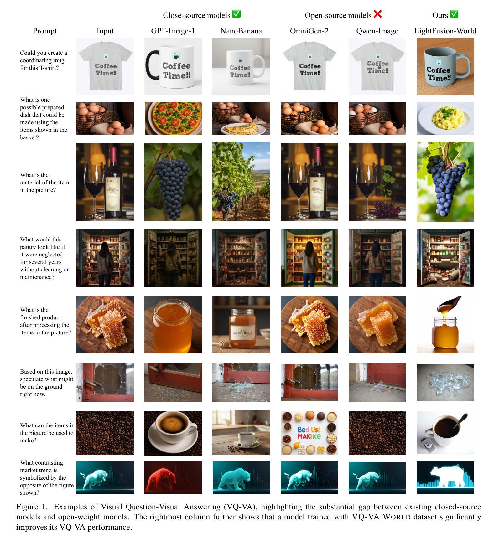 本文介绍了视觉问答视觉回答(VQ-VA)领域的研究进展。为了将这一能力引入到开源模型中,提出了一种以数据为中心的方法VQ-VA World,并构建了一个大规模、有针对性的数据构建管道。利用大规模部署,该管道爬取了约180万高质量图像文本样本用于模型训练。同时,本文还发布了评估VQ-VA的智能基准测试IntelligentBench,包括世界知识、设计知识和推理等方面。使用VQ-VA World数据训练模型取得了显著进展,LightFusion模型在IntelligentBench上的得分达到53.06,远超之前的开源基准,并缩小了与领先专有系统的差距。本文公开了全套模型权重、数据集和管道,以刺激未来对VQ-VA的研究。