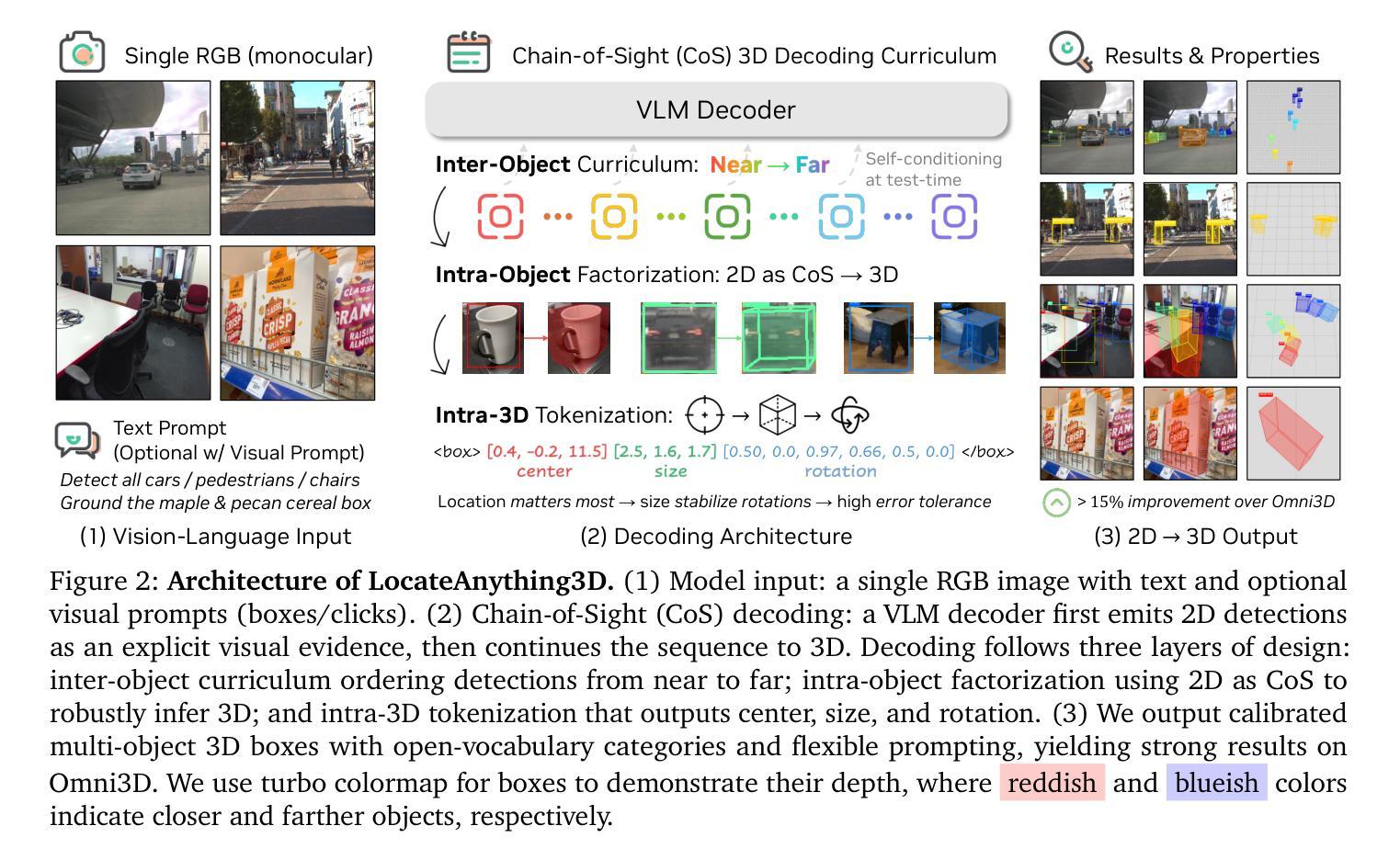 - LocateAnything3D是一个适用于视觉语言模型(VLM)的框架,可将多目标三维检测转化为下一个词预测问题。
