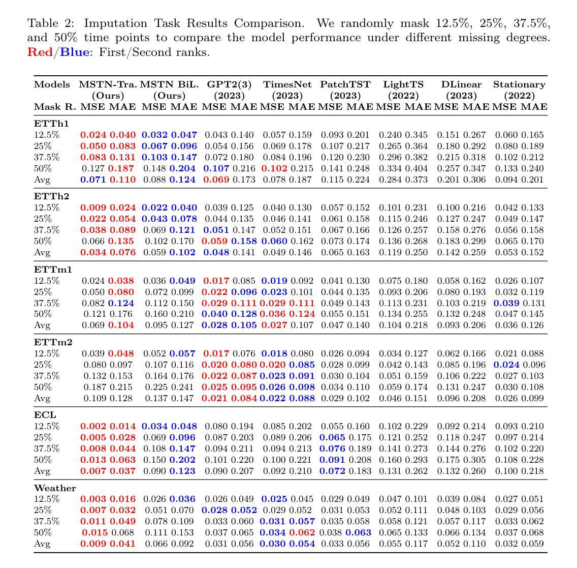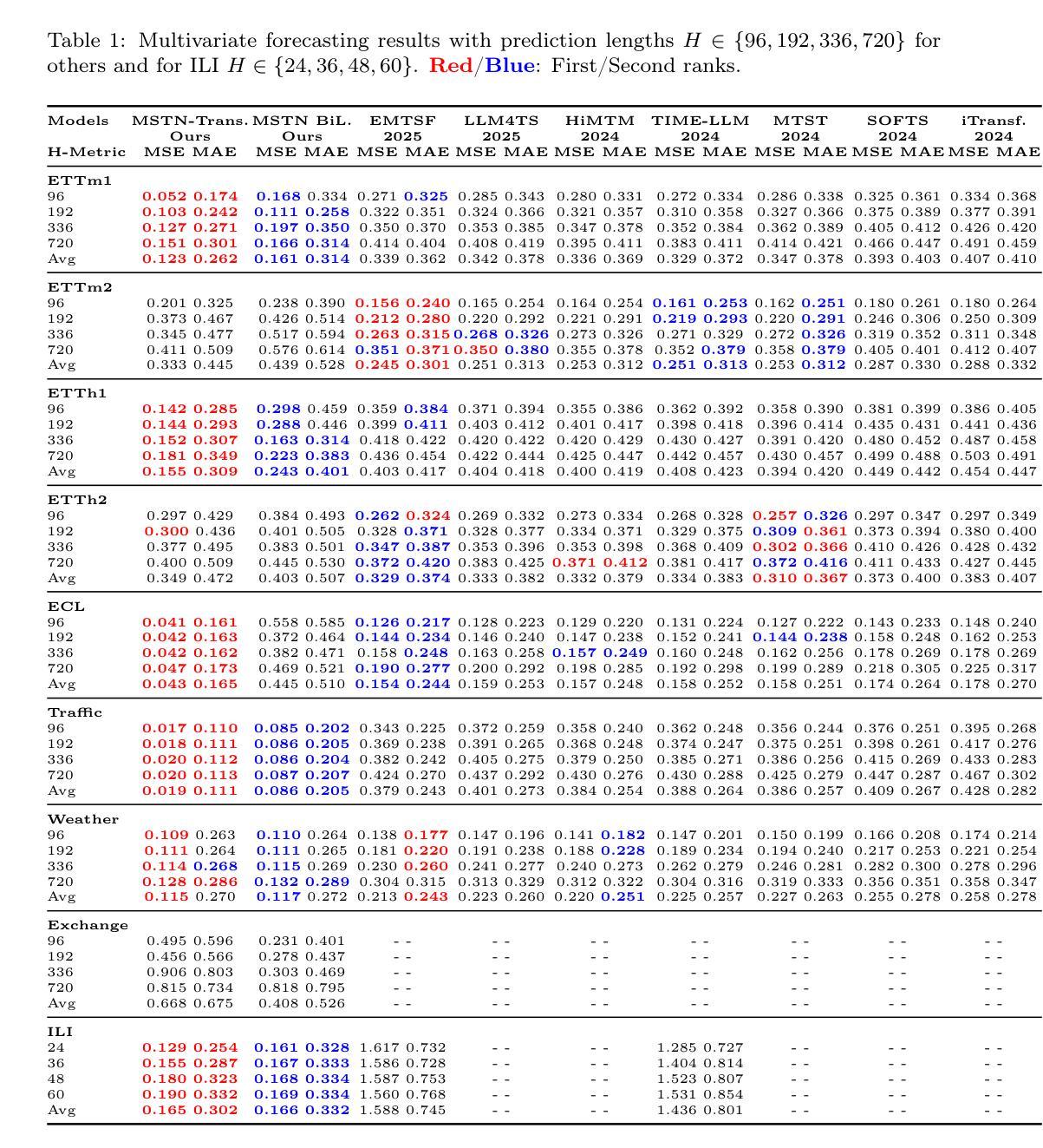 - 在多个基准数据集上的评估表明,MSTN在24个基准数据集中的32个数据集上取得了最佳性能。