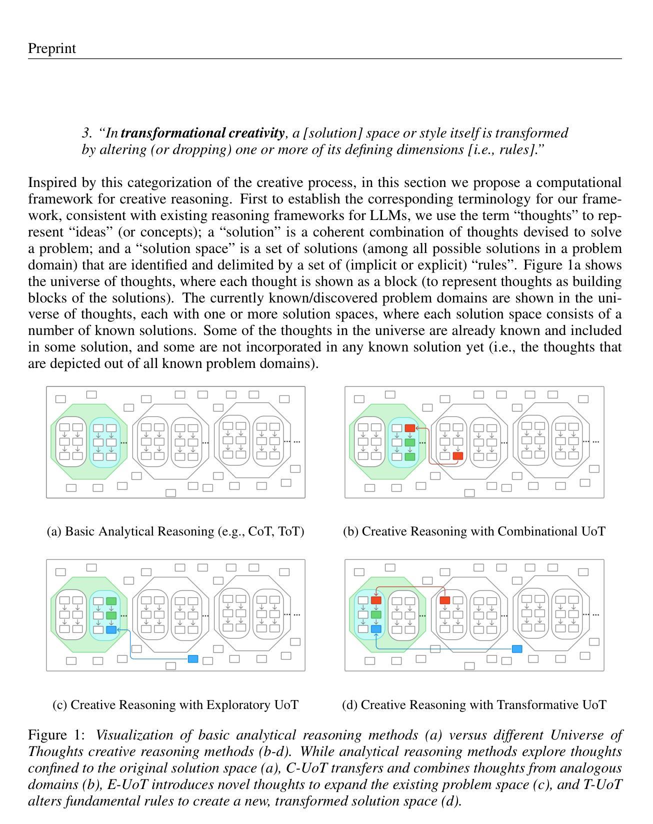 为了弥补这一空白,我们首先借鉴认知科学的原则,引入了一个用于创造性推理的计算框架。在该框架下,我们提出了三种核心创造性推理范式,即组合推理、探索性推理和变革性推理,每种范式都提供了特定方向,以系统地探索思维宇宙,从而产生创造性解决方案。