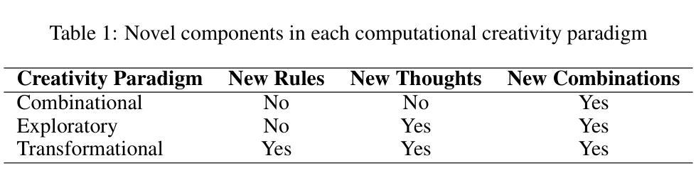 - 本文提出了一个计算创造性推理的框架,包括三种核心创造性推理模式:组合、探索和变革性推理。