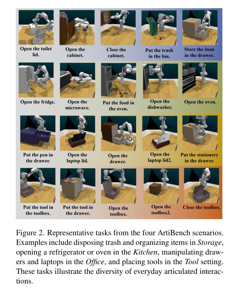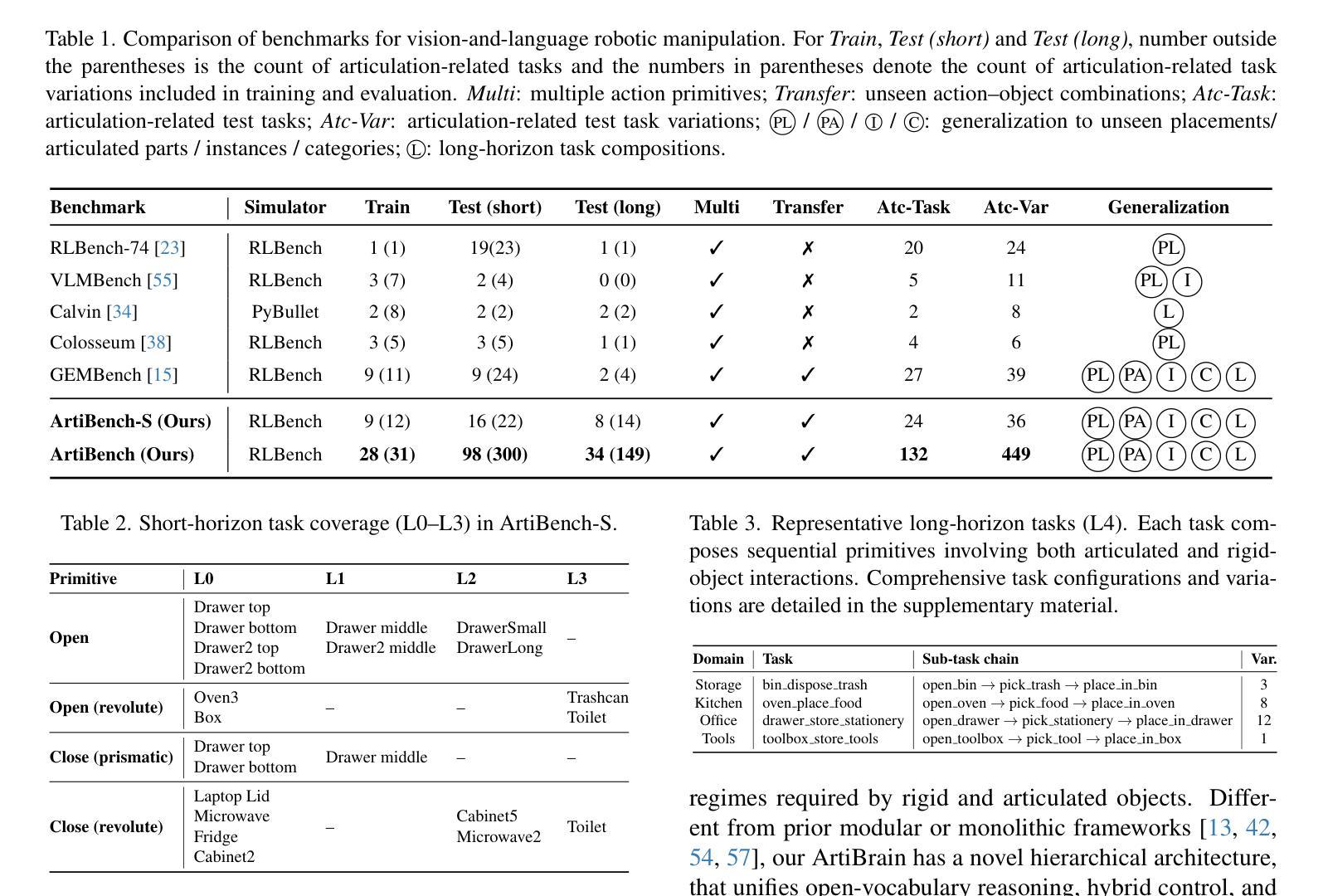 - ArtiBench作为一个新的基准测试,分为五个层次,涵盖了多种环境,用于评估互动型物体操作的通用性挑战。