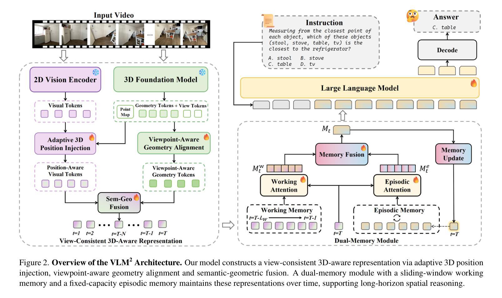 空间推理对于智能机器人来说是一项至关重要的能力,然而,当前的视觉语言模型(VLM)在基于视频的空间推理方面仍然达不到人类水平的性能。这一差距主要源于两个挑战:语义几何的不对齐,这阻碍了连贯的3D理解;以及缺乏持久记忆,无法长时间保留3D表示和理解。为了解决这些局限性,我们提出了VLM$^2$,这是一种具有持久记忆的空间推理视觉语言模型,通过纯粹的二维视频获得视角一致、具有三维意识的表示。具体来说,为了提高长期推理能力,我们融入了一个双内存模块,包括一个作为滑动窗口来关注即时上下文的工作内存,以及一个整合和存储关键长期信息的情景记忆。这种设计能够以固定的计算成本实现高效和长期的空推理。在多个基准测试上的广泛实验表明,VLM$^2$在仅使用视频模型的条件下达到了最先进的性能,显著地推动了视觉空间智能的边界。