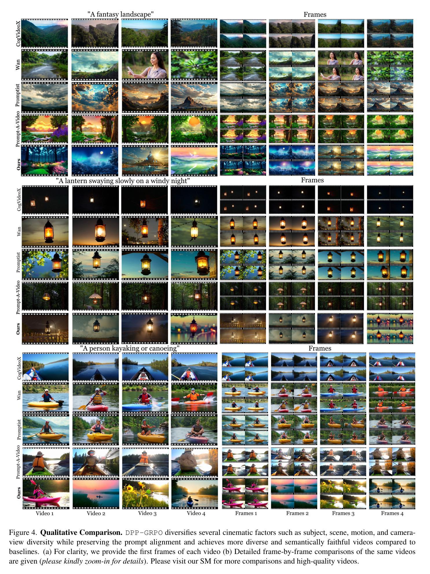 - DPP-GRPO方法鼓励在视觉外观、相机运动和场景结构方面生成多样化的视频。