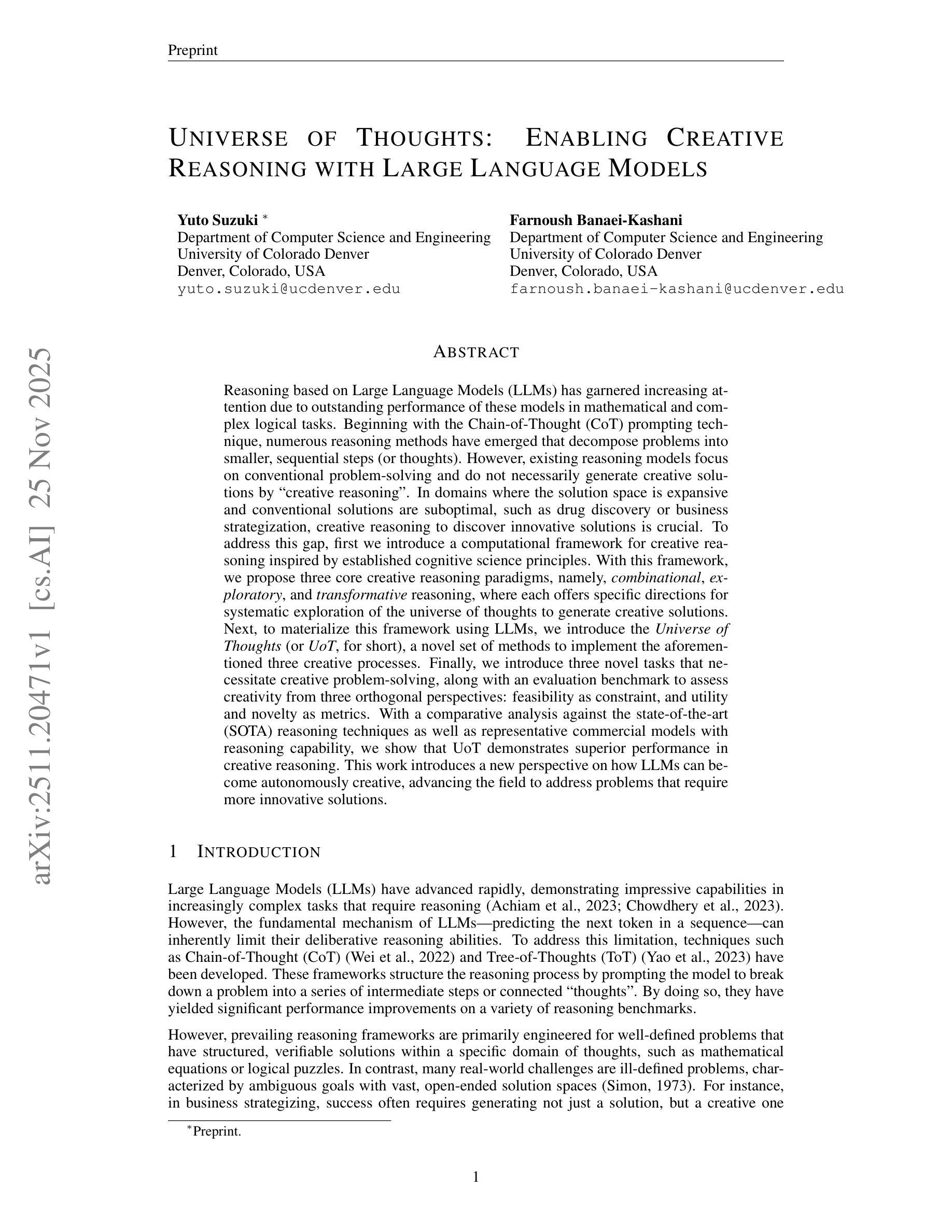大型语言模型(LLM)的推理能力因其在数学和复杂逻辑任务中的出色表现而受到越来越多的关注。当前出现的许多推理方法,如链式思维(CoT)技术,能够将问题分解为更小、有序的步骤。然而,现有的推理模型主要关注常规问题解决,并不一定能通过“创造性推理”来发现创新解决方案。在解决方案空间广阔且常规解决方案不够理想(如药物发现或业务策略制定)的领域中,创造性推理至关重要。为此,本文借鉴认知科学原则,提出了一个计算创造性推理的框架,并设计了三种核心创造性推理模式,即组合推理、探索性推理和变革性推理。为了利用大型语言模型实现这一框架,本文提出了“思维宇宙”(UoT)方法集。通过与传统最新技术和具有推理能力的商业模型对比,本文展示了UoT在创造性推理方面的优越性。