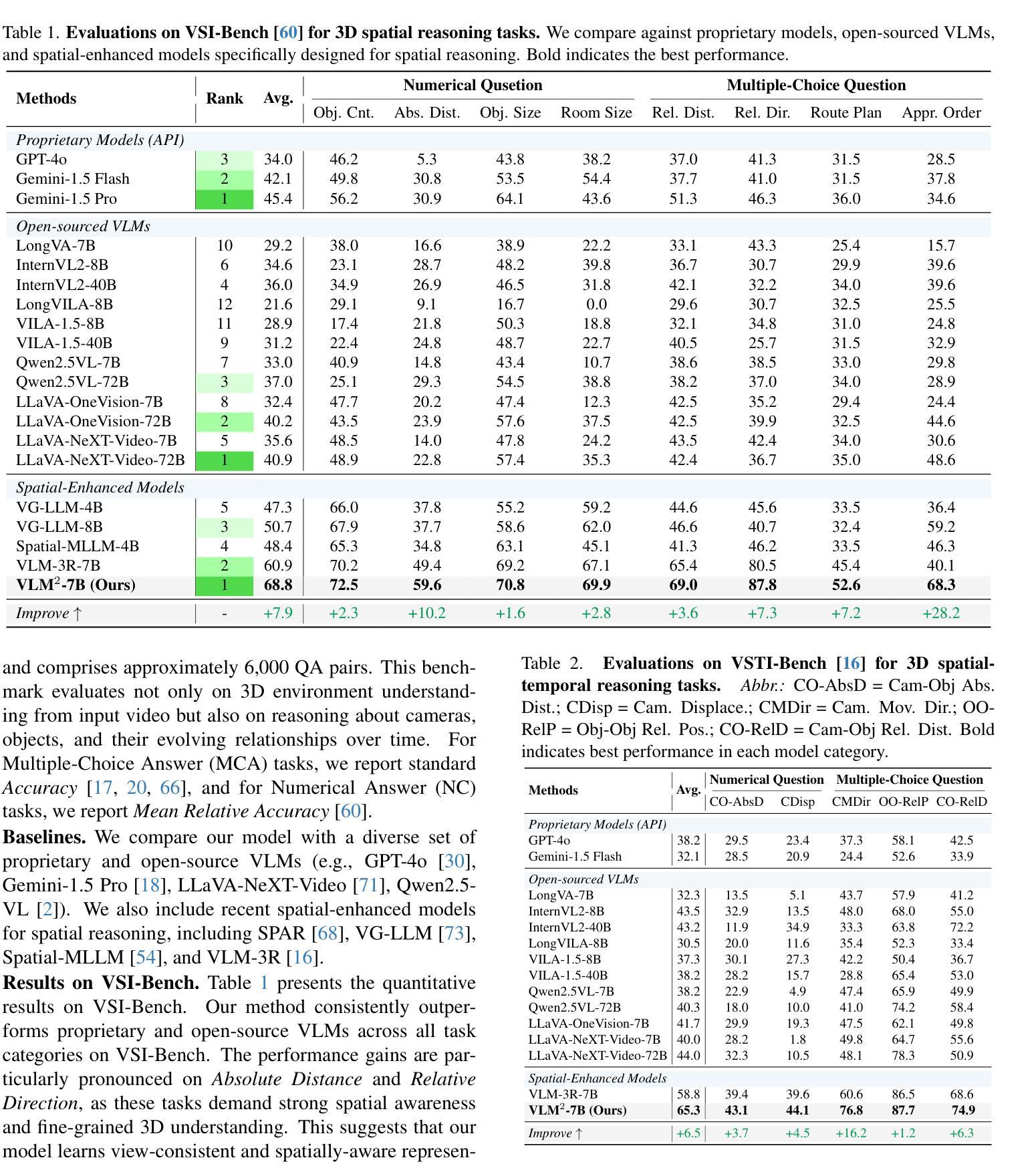 - 当前视觉语言模型(VLM)在视频基的空间推理上性能仍待提升。