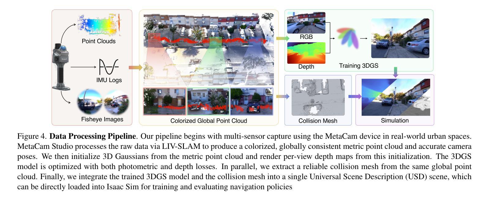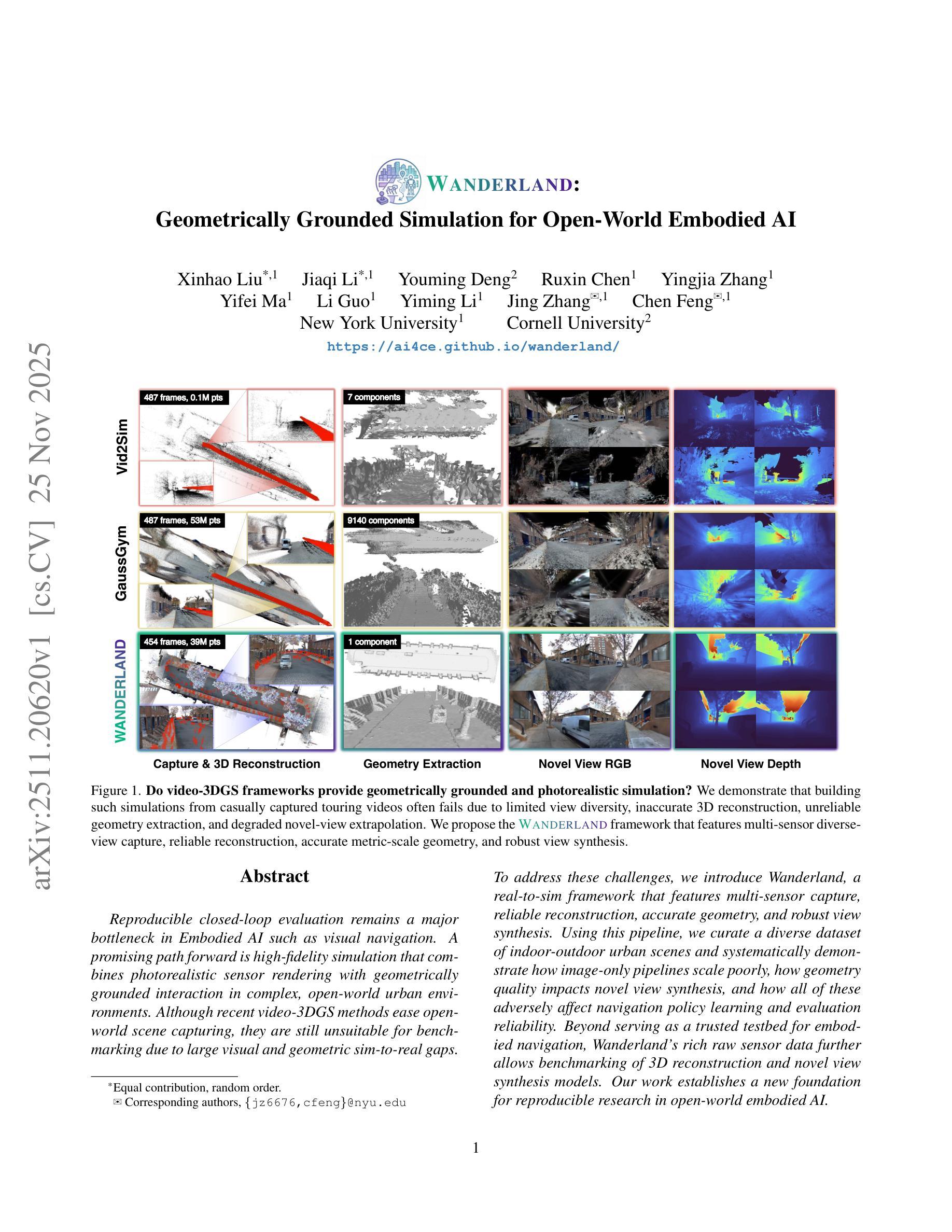 在嵌入式人工智能(如视觉导航)中,可重复闭环评估仍然是一个主要瓶颈。前景看好的一条道路是高保真模拟,它将逼真的传感器渲染与复杂开放世界城市环境中的几何交互相结合。尽管最近的视频-三维全球定位系统(video-3DGS)方法使开放世界场景捕获变得容易,但由于视觉和几何仿真与实际差距较大,它们仍然不适合作为基准测试。为了应对这些挑战,我们引入了Wanderland,这是一个从现实到模拟的框架,具有多传感器捕获、可靠重建、精确几何和稳健的视图合成等特点。使用这个管道,我们编制了室内外城市场景的多元数据集,系统地展示了只有图像管道扩展不佳的方式、几何质量对新颖视图合成的影响以及所有这些如何对导航策略的学习和评估可靠性产生不利影响。除了作为可靠的测试平台用于嵌入式导航外,Wanderland丰富的原始传感器数据还允许对三维重建和新颖视图合成模型进行基准测试。我们的工作为开放世界嵌入式人工智能的可重复研究建立了新的基础。项目网站位于https://ai4ce.github.io/wanderland/。