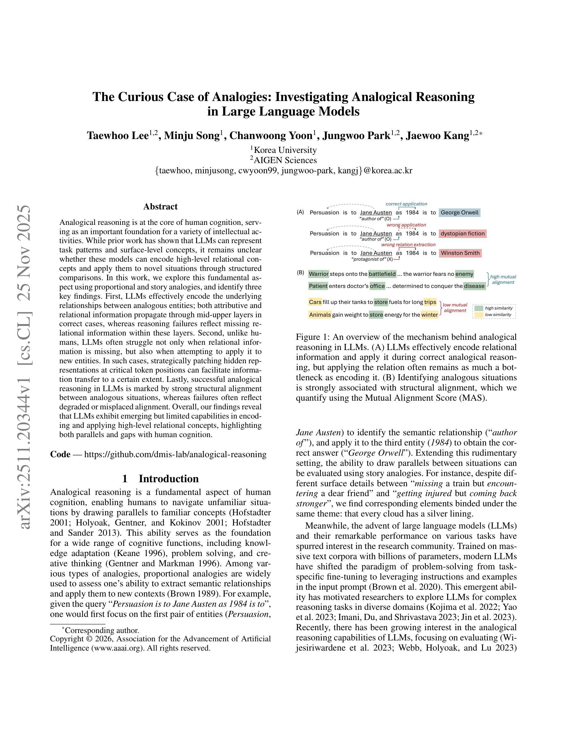 类比推理是人类认知的核心,为各种智力活动提供重要基础。虽然之前的研究已经表明,大型语言模型可以表示任务模式和表面级概念,但尚不清楚这些模型是否能够通过结构化比较编码高级关系概念并将其应用于新情况。在这项研究中,我们使用比例和故事类比来探索这一基本方面,并识别出三个关键发现。首先,大型语言模型有效地编码了类似实体之间的潜在关系;在正确的情况下,属性和关系信息会在中上层传播,而推理失败则反映了这些层次中缺失的关系信息。其次,与人类不同,大型语言模型不仅在关系信息缺失时遇到困难,而且在尝试将其应用于新实体时也会遇到困难。在这种情况下,在关键令牌位置修补隐藏表示可以在一定程度上促进信息传递。最后,大型语言模型中的成功类比推理标志着类似情况之间的强大结构对齐,而失败往往反映了对齐的退化或错位。总的来说,我们的研究结果表明,大型语言模型在编码和应用高级关系概念方面呈现出新兴但有限的能力,这既体现了与人类认知的相似之处,也突显了差异。