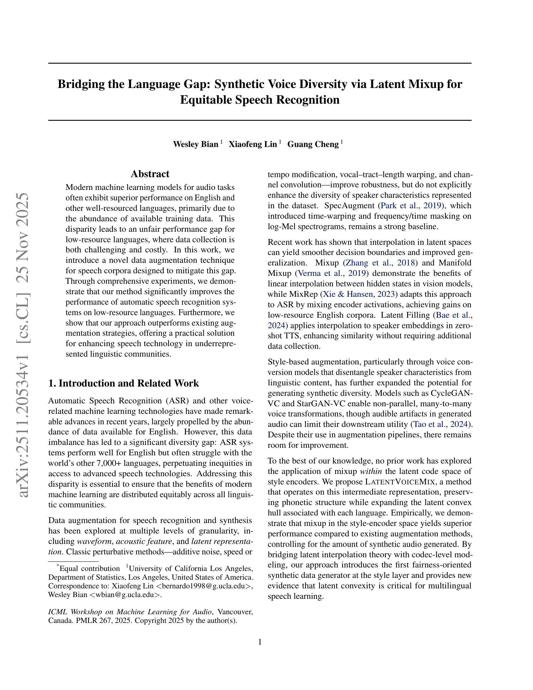 在现代机器学习模型中,英语和其他资源丰富语言的音频任务性能通常较优越,这主要归因于大量可用的训练数据。然而,对于资源匮乏的语言,数据收集既具挑战性又成本高昂,导致性能上存在不公平的差距。本研究介绍了一种针对语音语料库的新型数据增强技术,旨在缩小这一差距。通过综合实验,我们证明该方法能显著提高低资源语言上的语音识别系统性能。此外,我们的方法优于现有增强策略,为增强欠代表性语言社区的语音技术提供了实用解决方案。
