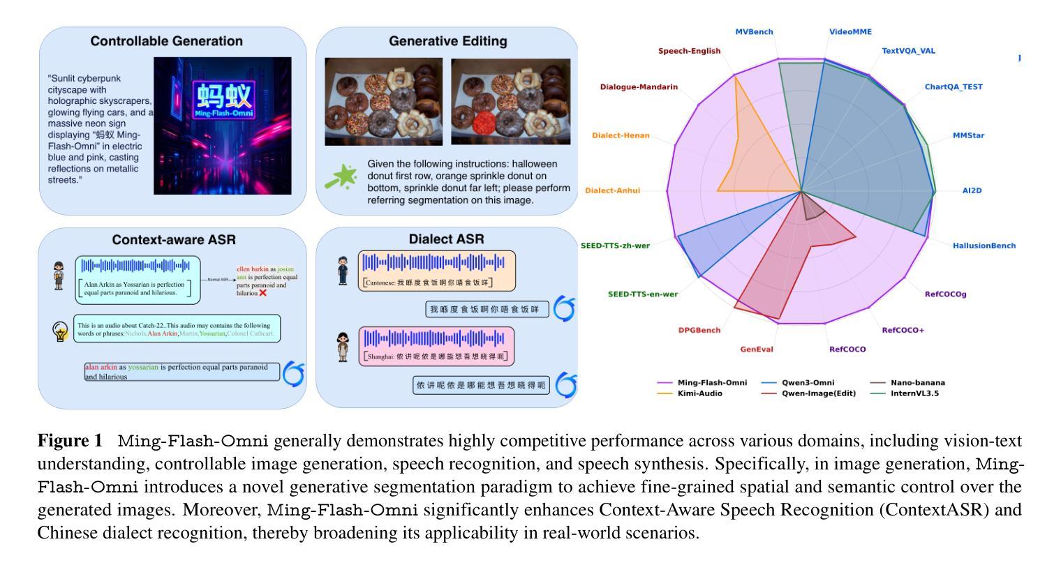 我们提出了Ming-Flash-Omni,它是Ming-Omni的升级版,建立在更稀疏的专家混合(MoE)变体Ling-Flash-2.0之上,总参数达100亿,其中每令牌仅活跃6.1亿个参数。这种架构实现了高效扩展(在大幅提高计算效率的同时显著扩大了模型容量),并在视觉、语音和语言的跨模态智能中赋予了更强的统一能力,朝着通用人工智能(AGI)迈出了关键一步。与前代产品相比,升级版在跨模态理解和生成方面取得了显著进步。我们显著提高了语音识别能力,在上下文ASR中实现了最新性能,并在方言感知ASR中取得了具有竞争力的结果。在图像生成方面,Ming-Flash-Omni引入了高保真文本渲染,并在场景一致性和身份保留的图像编辑过程中取得了显著进展。此外,Ming-Flash-Omni引入了生成分割功能,不仅实现了强大的独立分割性能,还提高了图像生成中的空间控制并改善了编辑一致性。值得注意的是,Ming-Flash-Omni在文本到图像生成和生成分割方面取得了最新结果,并在所有12个上下文ASR基准测试中创造了新纪录,所有这些都在一个统一的架构内完成。