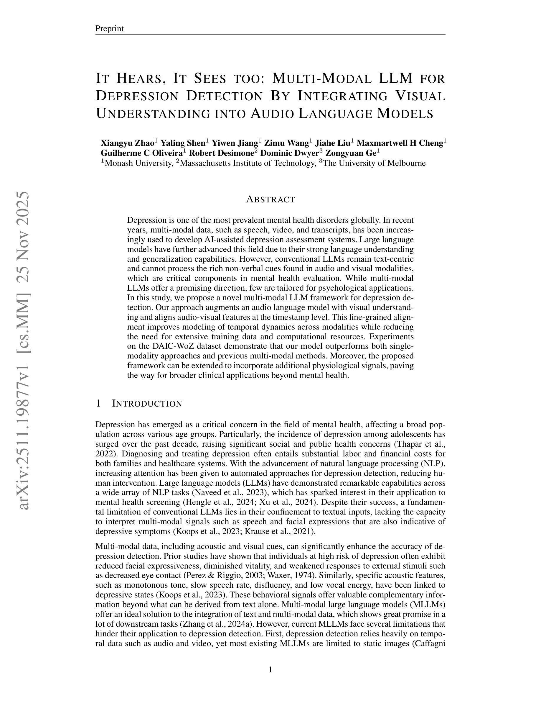 抑郁症是全球最常见的精神健康障碍之一。近年来,语音、视频和文本等多模态数据越来越多地被用于开发人工智能辅助的抑郁症评估系统。大型语言模型由于其强大的语言理解和泛化能力,进一步推动了这一领域的发展。然而,传统的大型语言模型仍然以文本为中心,无法处理音频和视觉模式中发现的大量非言语线索,而这些线索在精神健康评估中是至关重要的组成部分。虽然多模态大型语言模型提供了一个有前途的方向,但很少有针对心理应用的定制。在研究中,我们提出了一种用于抑郁症检测的新型多模态大型语言模型框架。我们的方法通过视觉理解增强音频语言模型,并在时间戳级别对齐音频-视觉特征。这种精细的对齐提高了跨模态的暂时动态建模能力,同时减少了大量训练数据和计算资源的需求。在DAIC-WoZ数据集上的实验表明,我们的模型在单模态方法和先前的多模态方法上表现出超越的性能。此外,所提出的框架可以扩展以纳入其他生理信号,为精神健康之外更广泛的临床应用铺平道路。
