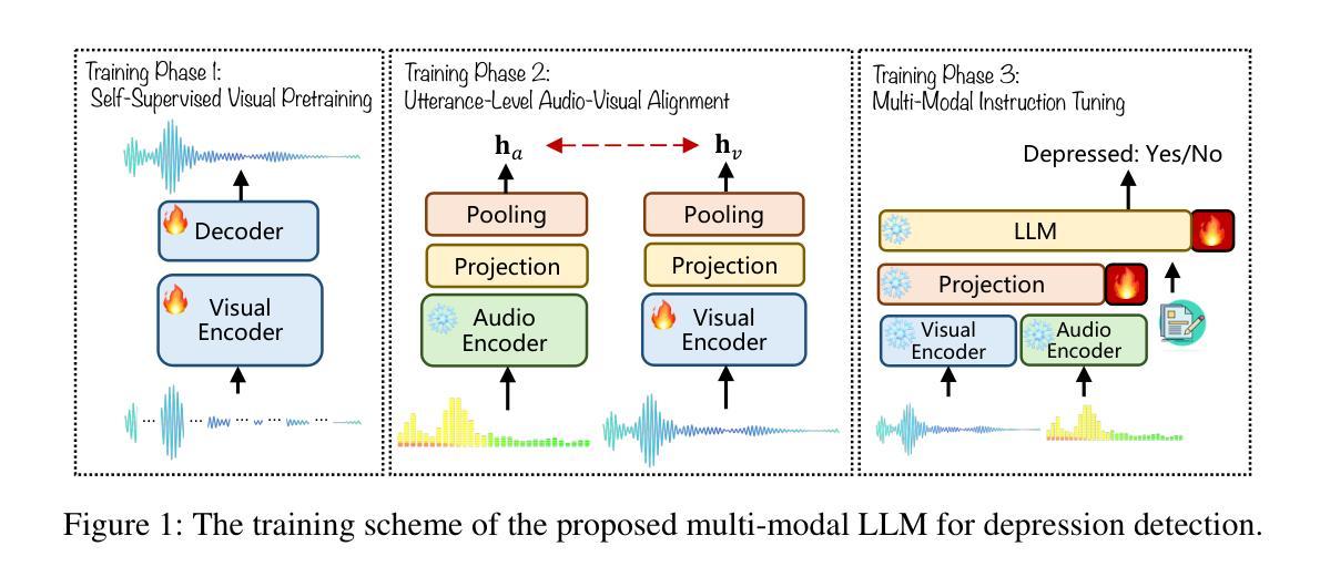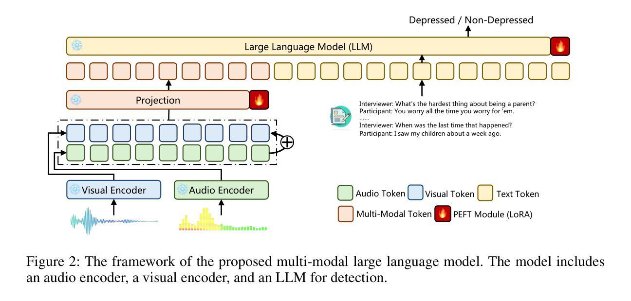 - 本研究提出一种新型多模态大型语言模型框架,用于抑郁症检测,通过精细对齐音频和视觉特征,提高建模能力并减少训练数据和计算资源需求。